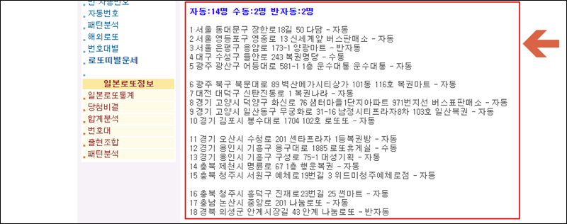로또 1등을 당첨이 많이 된 판매점에 대한 정보도 이곳에서 조회가 가능합니다. 회차별로 확인할수도 있고, 전체적으로 조회도 가능합니다.