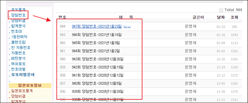 새롭게 열린 페이지를 보면 좌측에 여러 가지 메뉴가 나타납니다. 2021년 1월 23일까지 로또당첨번호 정보를 조회할 수 있는 메뉴를 클릭해 주세요.