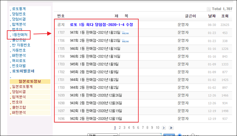 새롭게 열린 페이지를 보면 좌측에 여러 가지 메뉴가 나타납니다. 2021년 1월 23일까지 로또당첨번호 정보를 조회할 수 있는 메뉴를 클릭해 주세요.