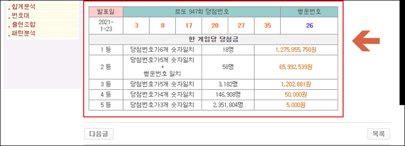 회차 또는 게시글을 클릭해 보세요. 그럼 발표일, 로또당첨번호, 행운번호, 한 게임당 당첨금을 확인할 수 있습니다.