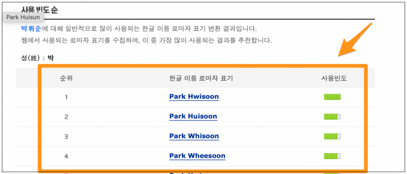 새롭게 열린 페이지를 통해 더 많은 한글변환 결과가 나타나는데요. 사용 빈도순으로 영어이름이 정렬이 되어 있어요. 아무래도 사용하는 횟수가 높은 것을 사용하는 것이 문제가 적을 수 있어요. 그렇다고 1위를 선택하기 보다는 한 번 더 알아보고 선택해도 늦지 않아요. 여기에 나온 로마자 표기를 마우스로 클릭해 보세요.