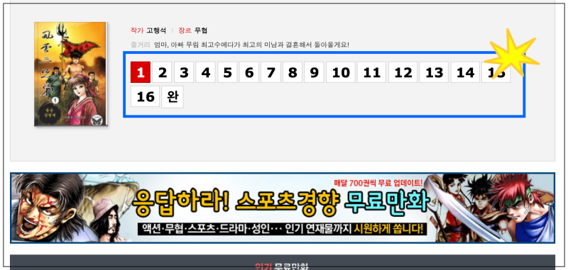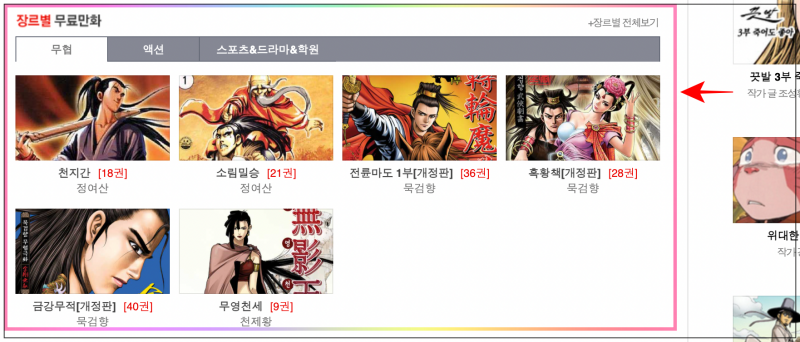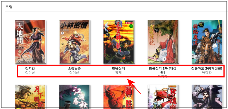 무협, 액션, 드라마, 스포츠 장르별로 여러 만화책이 업데이트 되었는데요. 무협 작가로 유명한 정여산, 황재, 묵검향 작가의 작품이 많이 올라왔네요. 해당 사이트는 천지간, 소림밀승, 천왕신맥, 창룡전기, 전륜마도 등 인기 작품을 만나볼 수 있는곳이에요.