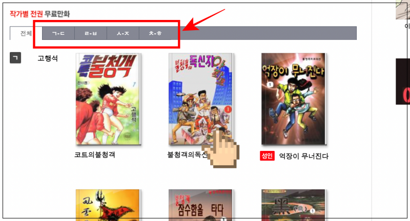 좋아하는 만화 작가가 있는 경우에는 작가별 전권 무료만화 카테고리를 살펴보아 주세요. 각 작가마다 해당 사이트에서 감상이 가능한 작품을 모아서 찾아볼 수 있어요. 여기서 감상을 하고 싶다면 해당 작품의 썸네일 또는 제목을 클릭하면 돼요.
