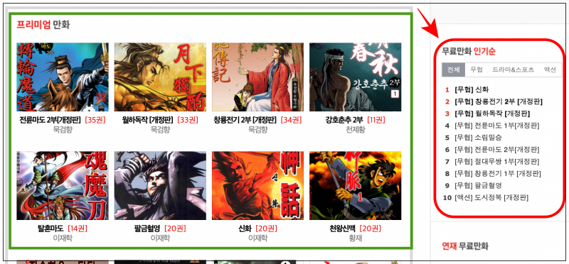 어떤 작품을 감상해야 할지 모를 수 있는데요. 그러한 경우 프리미엄 만화책 리스트와 무료 만화책 인기 순위를 참고해 보세요. 최근 인기 있는 무협 작품을 살펴보면 신화, 창룡전기, 월하독작, 전륜마도 등이 있네요.