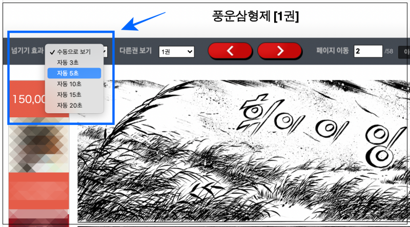 일일이 만화책 페이지를 넘기는 것이 귀찮을 때에는 좌측 상단에 있는 페이지 효과 기능을 사용해 보세요. 자동으로 3초에서 20초 사이로 넘기면서 볼 수 있어요.