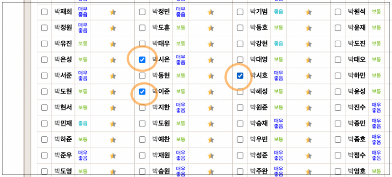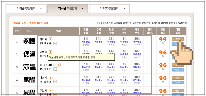 이곳에서 마음에 드는 성명 3가지를 선택한 후 "사주에 맞는 추천한자 보기" 버튼을 클릭해 보세요. 그럼 각 한글이름에 대하여 이에 맞는 한자를 5개씩 추천을 받을 수 있어요. 저는 보통 이상 등급인 박시온, 박이준, 박시호를 선택했어요.