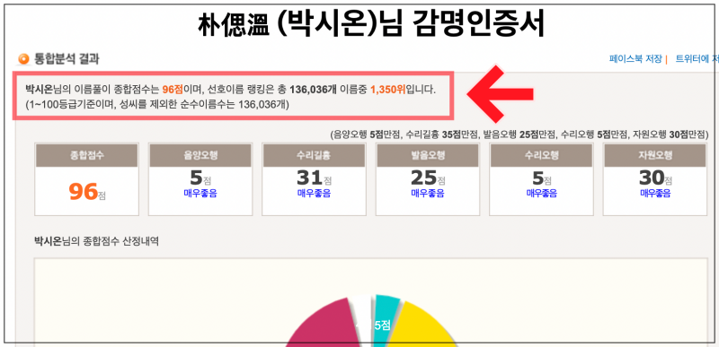 박시온이라는 남자아이 이름에 대한 감명인증서를 확인해 보았어요. 이름풀이 종합점수는 96점이고, 선호이름 랭킹은 전체 136,036개 한글이름 중에서 1,350위를 차지했다고 해요. 인증서 우측 상단을 보면 페이스북과 트위터에 저장할 수 있는 버튼이 있는데요. 해당 버튼을 통해 추천 받은 한글이름에 대한 감명인증서를 저장해 보세요.