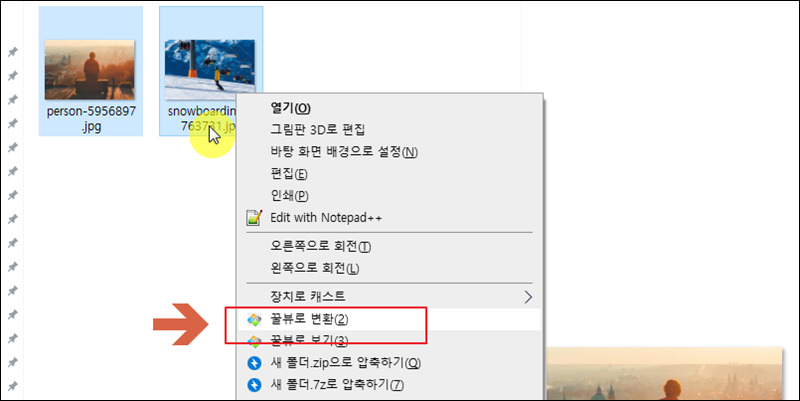 그럼 본격적으로 용량 줄이기를 하도록 하겠습니다. 일단 내컴퓨터를 통해 jpg 파일을 찾아주세요. 여러 파일의 용량을 줄이고 싶은 경우에는 드래그를 통해 여러 파일을 선택해 줍니다. 이 상태에서 마우스 우클릭을 누르면 메뉴가 나타나는데요. 해당 메뉴에서 꿀뷰로 변환 버튼을 클릭해 주세요. 변환을 통해 용량 줄이기를 진행할 수 있습니다.