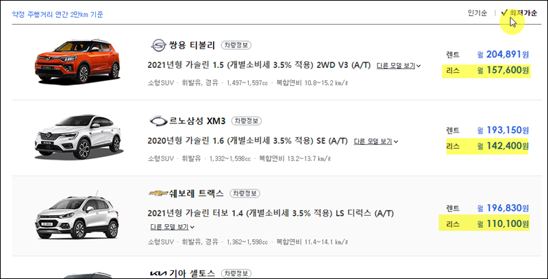저렴한 비용으로 리스 차량을 이용하고 싶다면 리스트 상단 우측에 있는 "최저가순"을 클릭해 주세요. 그럼 가장 저렴하게 이용할 수 있는 리스 자동차부터 가격 정보를 확인할 수 있어요. 참고로 약정 주행거리 연간 2만km 기준을 조건으로 한 것이에요.