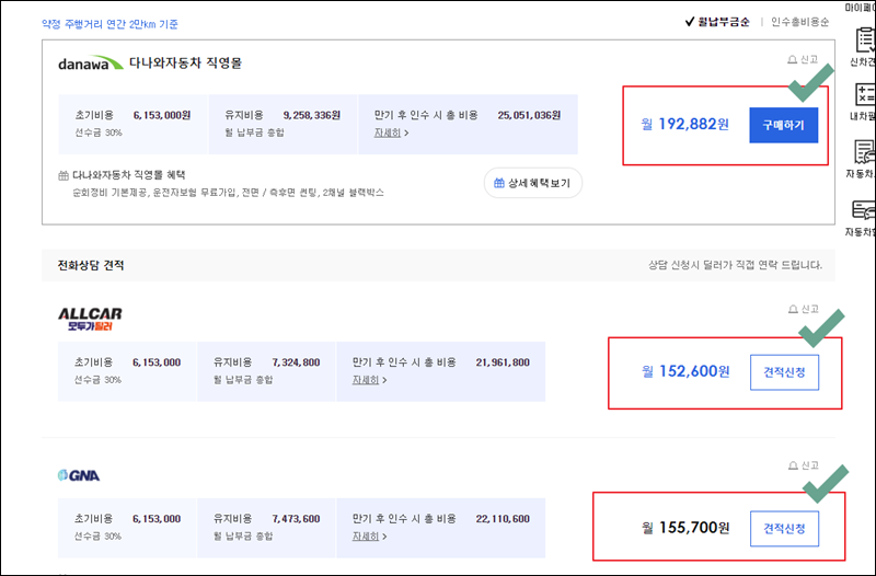 제가 지정한 조건에 맞는 자동차 가격표가 나타났어요. 리스와 렌트카에 대한 가격정보도 확인이 가능한데요. 기아의 쏘렌토가 리스 차량으로 인기가 많네요.