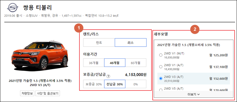 차량 리스에 대한 가격비교를 하기에 앞서 구매하길 원하거나 관심 있는 차량 모델을 선택해야 해요. 차종을 통해 모델 찾기를 할 수 있는데요. 저는 소형에서 대형까지 SUV 차량에 대해 알아보려고 해요. 여기에 더하여 리스 이용기간과 계약 조건에 대한 것도 지정할 수 있어요.