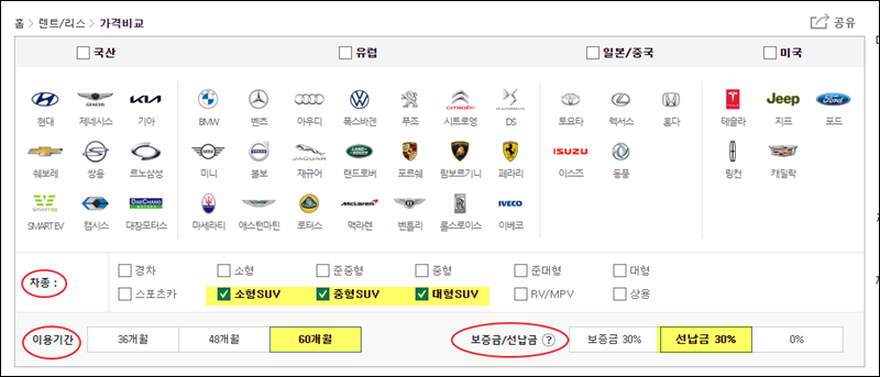 차량 리스에 대한 가격비교를 하기에 앞서 구매하길 원하거나 관심 있는 차량 모델을 선택해야 해요. 차종을 통해 모델 찾기를 할 수 있는데요. 저는 소형에서 대형까지 SUV 차량에 대해 알아보려고 해요. 여기에 더하여 리스 이용기간과 계약 조건에 대한 것도 지정할 수 있어요.