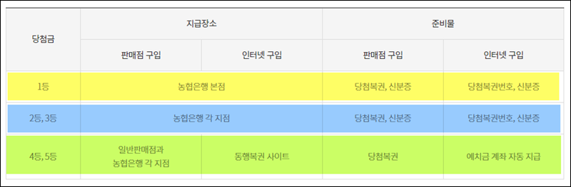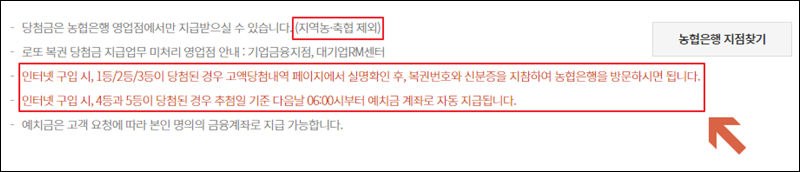 추가로 확인해야 할 로또복권 당첨금 수령방법이 있어요. 바로 지역농협이나 축협은 해당되지 않는다는 것이에요. 인터넷으로 구입한 경우라도 1등에서 3등 사이로 로또복권에 당첨이 된 경우라면 당첨금을 받기 위해 농협은행에 방문해야 해요.