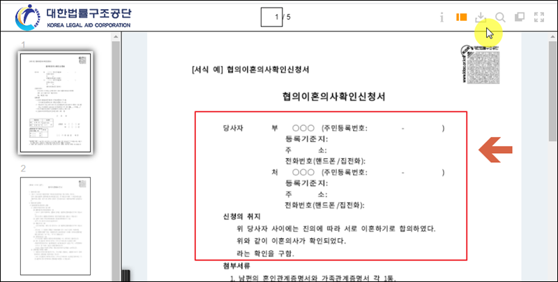 바로 보기 버튼을 클릭해 보았어요. 합의 이혼을 할 때 법원에 제출하는 신고서 양식을 살펴볼 수 있는데요. 양식에서 빈 칸을 채워 넣기만 하면 되기 때문에 신고서를 작성하는 것은 어렵지 않아요. 양식 파일을 다운 받으려면 미리보기 화면에서 우측 상단에 있는 다운로드 버튼을 누르면 돼요.