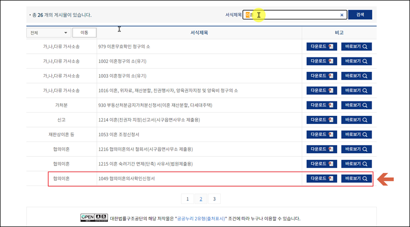 꽤 많은 양식이 있기 때문에 검색을 통해 합의 이혼 신고서 양식을 찾아야 해요. 우측 상단에 있는 서식 제목에 "이혼"을 입력한 후 검색 버튼을 클릭해 주세요. 그럼 총 26개의 게시물이 나타나는데요. 여기에서 협의 이혼 의사확인 신청서를 선택하면 돼요. 다운로드 버튼을 누르면 양식 파일을 아래아 한글 문서 포맷으로 바로 다운이 가능하고요. "바로보기" 버튼을 클릭하면 양식을 다운로드 하기 전에 해당 양식이 어떻게 생겼는지 미리 볼 수 있어요.