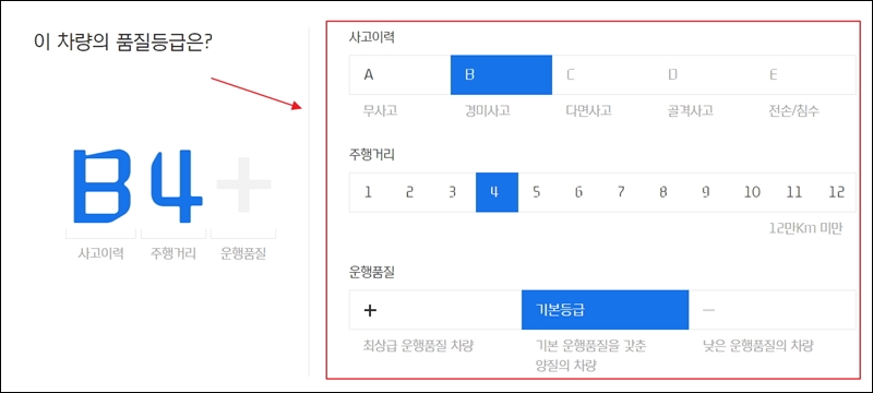 해당 중고차 매물에 대한 품질 등급도 확인이 가능한데요. 사고 이력, 주행거리, 운행품질을 기준으로 자세히 살펴볼 수 있어요.