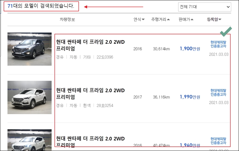 현대 싼타페 더 프라임을 선택한 결과 71개의 실매물이 검색이 되었어요. 표를 통해 간단하게 연료 타입, 기어, 차번호, 연식, 주행거리, 판매가, 등록일을 알아볼 수 있는데요. 아무래도 등록일이 최근에 가까운 중고차일수록 실매물일 가능성이 높아요.