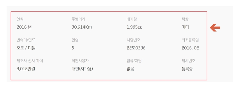 중고차 매매사이트에서 매물 선택 시에 기본적으로 알아야 하는 정보도 확인이 가능해요. 연식, 변속기, 연료, 인승, 차량 번호, 최초등록일, 배기량, 색상, 주행거리 등 꼼꼼히 확인해 보세요.