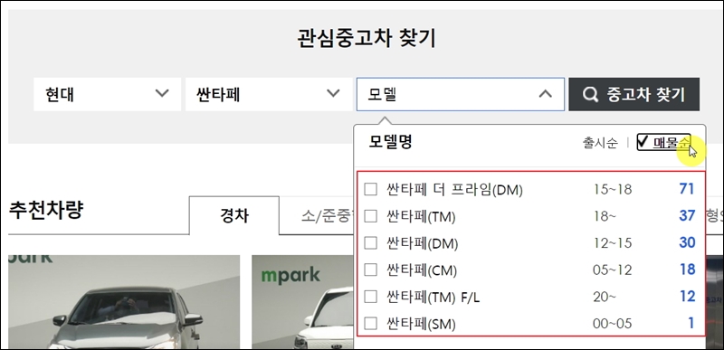 현대자동차 중에서 중고차 실매물이 많은 SUV인 싼타페를 선택했어요. 해당 시리즈의 모델도 선택이 가능한데요. 출시순과 매물순 2가지 기준으로 정렬이 가능하니 해당 정렬 기능을 참고하여 모델명을 선택해 주세요.
