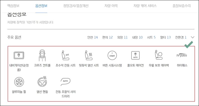 옵션의 경우 마음대로 바꾸기가 어려운데요. 그렇기 때문에 원하는 옵션이 탑재된 중고차를 구매하는 것이 좋아요. 네비게이션, 열선 시트, 하이패스 등 본인이 원하는 옵션이 탑재되어 있는지도 확인할 수 있어요.