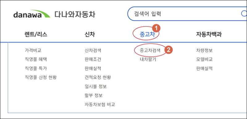 다나와 자동차 홈페이지에 접속했어요. 이곳은 중고차 매매사이트 서비스는 물론이고, 신차, 렌트, 리스 차량에 대해서도 알아볼 수 있어요. 그럼 실매물을 찾아볼게요. 메뉴에서 "중고차 검색"을 클릭해 보세요.