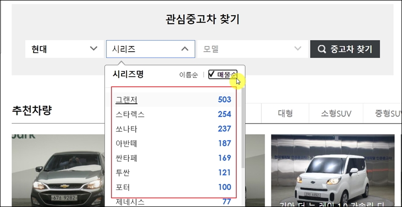 저는 현대의 실매물 중고차를 찾아보려고 하는데요. 시리즈를 클릭해 보니 매물이 많이 있네요. 그랜저, 스타렉스, 쏘나타, 아반떼, 싼타페, 투싼, 포터 순으로 매물이 많이 있네요. 중고차를 구매할 때에는 매물이 많을수록 가격을 알아보거나 마음에 드는 실매물을 구하기에 용이해요. 다른 중고차 매매사이트를 이용할 때에도 참고해 보세요.