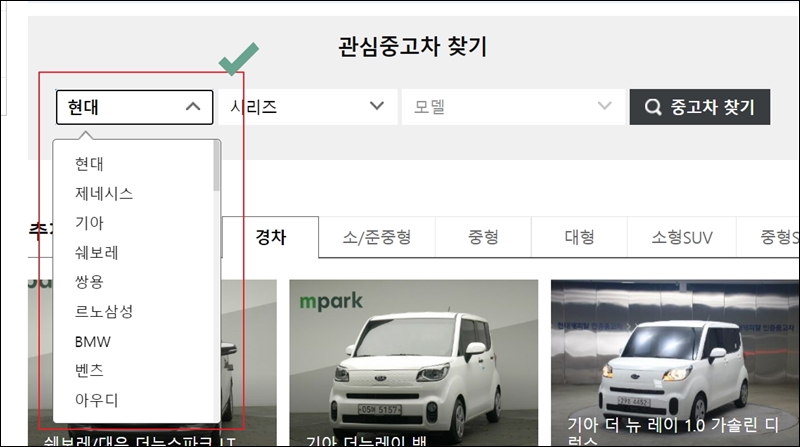 가장 먼저 해야 할 일은 관심 있는 중고차를 찾아야 하는데요. 브랜드, 시리즈, 모델을 차례대로 선택하면 돼요. 가장 먼저 선호하는 브랜드를 선택해 주세요. 현대, 제네시스, 기아, 쉐보레, 쌍용, 르노삼성 등 여러 브랜드 중에 하나를 선택하면 돼요.