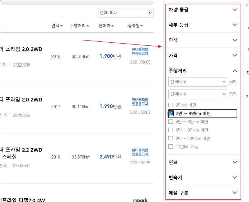71개의 매물에 대해서 또 한번 조건 선택이 가능해요. 차량 등급, 세부 등급, 연식, 가격, 주행거리, 연료 타입, 변속기, 매물 구분을 기준으로 조건 설정이 가능한데요. 개인적으로 주행거리를 주로 보는 편이에요. 중고차 매매사이트에서 2만에서 4만 km 사이로 지정해 볼게요.