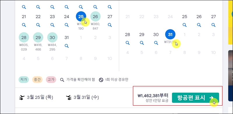 항공권 검색 버튼을 누르면 이렇게 달력 형식으로 베트남 하노이 비행기표 가격이 나타나는데요. 요즘 해외여행이나 출장을 가는 일이 많이 줄었기 때문에 항공편이 거의 없네요. 3월의 경우 25일에 출발하는 항공편이 있는데요. 평소보다 꽤 비싸다는 것을 알 수 있어요. 항공편이 많을수록 더욱 저렴한 가격을 찾을 수 있으니 다음을 기대해 보세요.