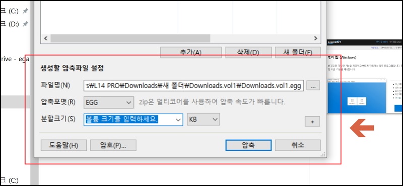 새롭게 화면에 나타난 창을 보면 생성할 결과물에 대해 몇 가지 설정을 할 수 있는데요. 앞서 보았던 창과 크게 다르지 않아요. 우선 결과물이 저장될 위치를 지정해 주고요. 그 다음으로는 파일명, 압축 포맷, 분할 크기를 지정해 주면 돼요. 설정 이후에는 "압축" 버튼을 클릭하면 돼요.