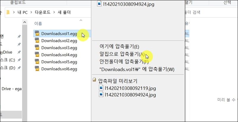 다시 해볼게요. egg 파일 중에서 첫 번째 파일에 마우스 우클릭을 한 후 "압집으로 압축풀기"를 클릭해 볼게요.