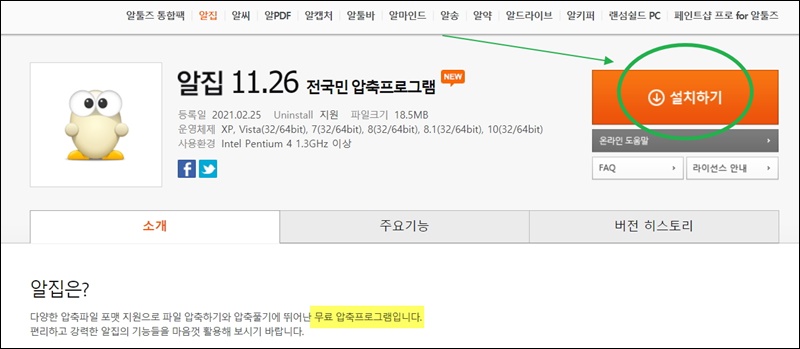 두번째로 알려드리는 프로그램은 알집인데요. 오래전부터 많은 사람들이 이용하던 프로그램이기 때문에 현재까지도 이용자가 꽤 많아요. 이번 시간에는 알집을 이용하여 압축 풀기를 해보려고 하는데요. 알툴즈 사이트에서 "설치하기" 버튼을 눌러서 해당 프로그램을 설치해 주세요.