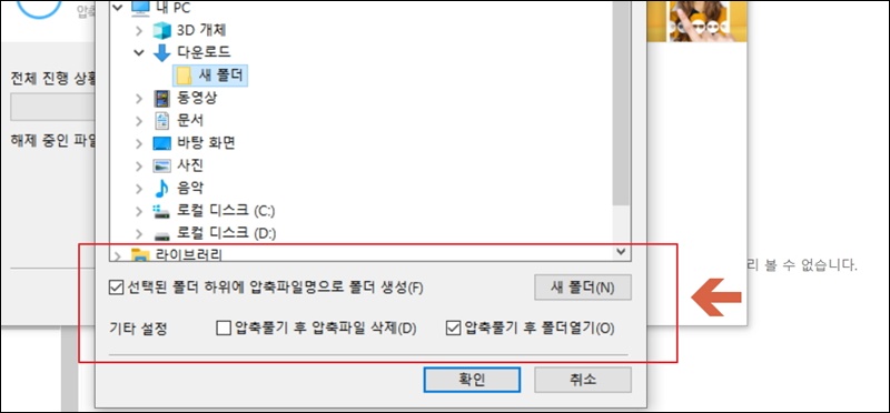 그럼 결과물을 저장할 폴더를 선택할 수 있는 창이 열려요. 기타 설정 부분을 보면 압축 해제 이후에 기존 파일을 삭제하거나 결과물이 저장된 폴더 열기를 할 수 있어요. 그럼 결과물을 저장할 폴더의 위치를 설정한 상태에서 확인 버튼을 클릭해 주세요. 그럼 분할 압축 풀기를 완료할 수 있어요.