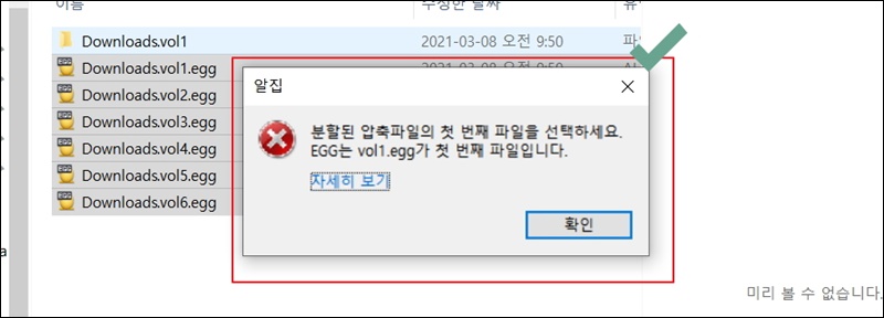 이때 주의해야 할 점이 있어요. 분할 압축이 된 경우에는 첫 번째 파일을 선택해야 해요. 첫 번째 파일에 마우스 우클릭을 해야 한다는 의미에요.