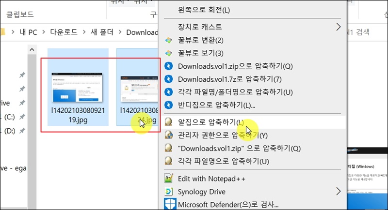 앞서 지정한 폴더를 열어보면 이렇게 결과물을 확인할 수 있어요. 해당 파일들은 다시 분할로 압축해 볼게요. 간단한 방법으로 할 수 있어요. 일단 해당 파일을 모두 선택해 주세요. 이 상태에서 마우스 우클릭을 한 후 "알집으로 압축하기" 버튼을 클릭해 주세요.
