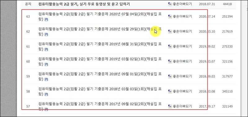 새롭게 열린 페이지를 통해 여러 회차의 기출문제로 구성된 게시판이 하나 나타나요. 조회수를 보면 아시겠지만, 꽤 많은 사람들이 이용했음을 알 수 있어요. 컴퓨터 활용능력 2급 자격증의 경우 업데이트도 꽤 잘되고 있네요.