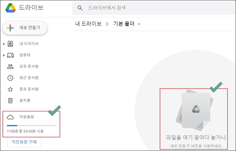 기본 화면이 나타났어요. 여기에서 우측 영역에 파일을 끌어다 놓거나 "새로 만들기" 버튼을 누르면 인터넷 저장소에 사진을 마음껏 올릴 수 있는데요. 물론 저장용량까지만 업로드가 가능해요. 제 경우에는 오랜 기간 사용하다보니 115기가나 되네요.