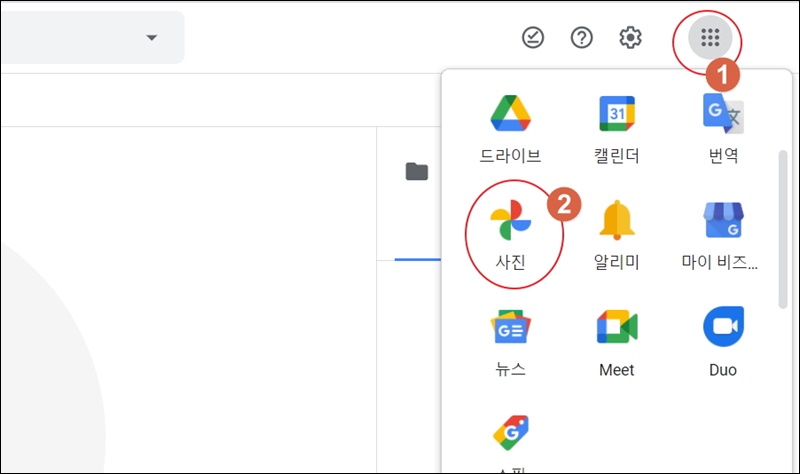 구글의 사진 전용 사이트를 이용하면 좀 더 많은 기능을 사용할 수 있어요. 파일 업로드 및 관리 부분에 있어서도 조금 더 편하고요. 사이트에서 우측 상단에 있는 전체 메뉴 버튼을 클릭해 보세요. 그럼 여러 가지 서비스 버튼이 나타나는데요. 여기에서 "사진" 메뉴를 클릭해 주세요.
