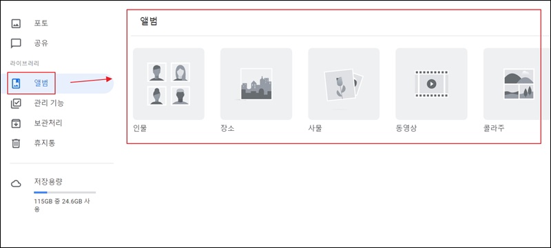 여기서는 우리가 인터넷 저장에 올린 사진에 대한 관리는 쉽게 할 수 있어요. 좌측에 있는 소메뉴에서 라이브러리 카테고리에 있는 서비스를 이용하면 되는데요. 앨범을 클릭해 보세요. 그럼 인물, 장소, 사물, 동영상, 콜라주와 같이 여러 기준을 통해 사진 분류를 쉽게 하고, 쉽게 찾아볼 수 있도록 되어 있어요.