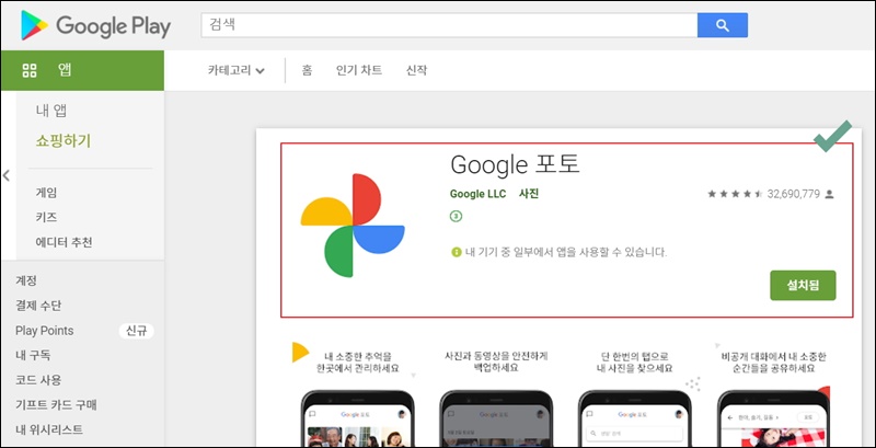 구글 드라이브와 구글 포토 모두 플레이스토어를 통해 스마트폰에 설치가 가능해요. 아무래도 스마트폰으로 촬영을 많이 하기 때문에 스마트폰에 사진이 저장되는 경우가 많죠. 이러한 경우 구글 포토 앱을 사용하면 폰으로 쉽게 파일 업로드 및 관리를 할 수 있어요.