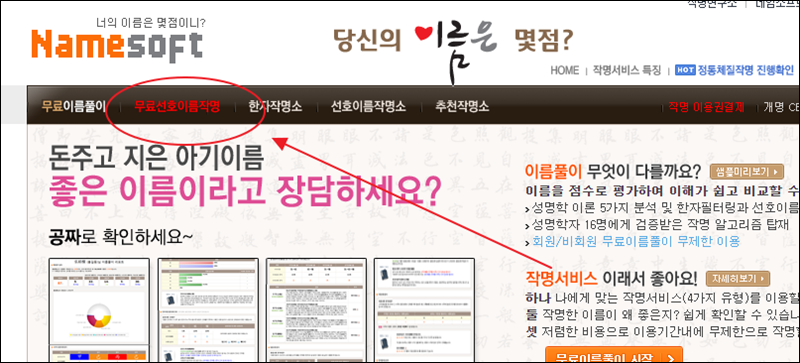 네임소프트 사이트에 접속했어요. 메뉴에서 무료 선호 이름 작명을 클릭해 주세요.