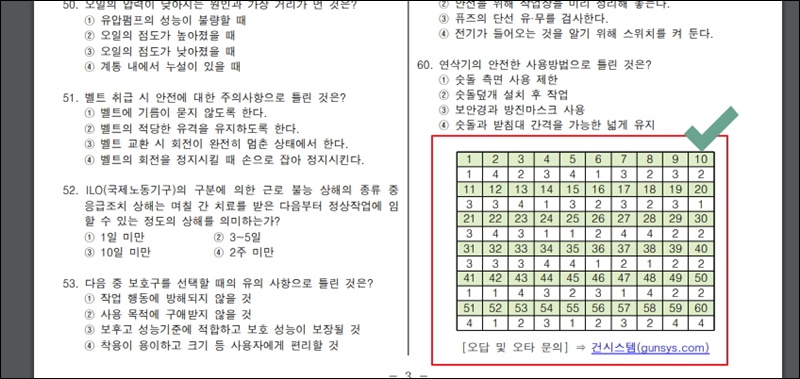 다운로드 받은 자료를 보면 문제에 답이 표시되어 있지 않은데요. 다 풀어본 이후에 채점을 할 때에는 마지막 페이지에 있는 정답표를 참고하면 돼요. 참고로 건시스템 사이트에서는 자료를 다운로드 받지 않고, 사이트에서 바로 기출문제를 풀어볼 수 있는 서비스도 제공하고 있는데요. 함께 이용해 보세요.