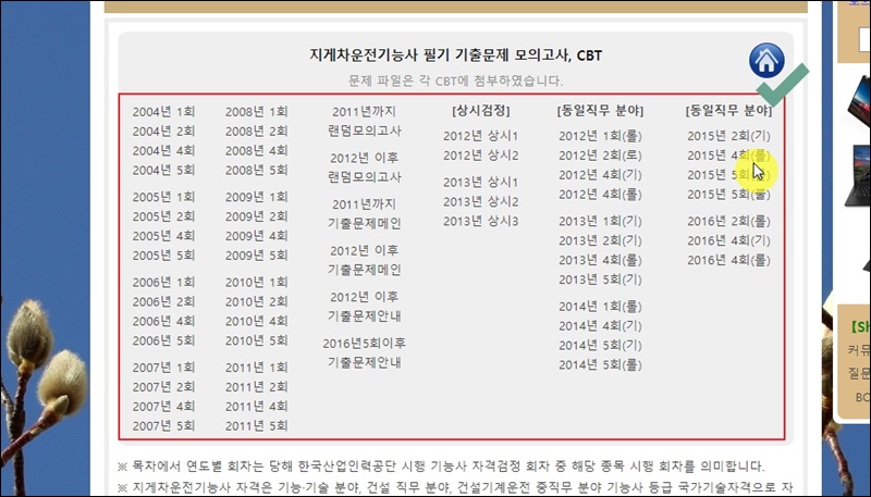 지게차 운전기능사 필기시험 기출문제 및 모의고사 페이지가 열렸어요. 꽤 많은 기간 동안 시행된 필기시험에 대한 자료에 접근할 수 있도록 되어 있어요. 이중에서 풀어보고 싶은 것을 선택해 보세요.
