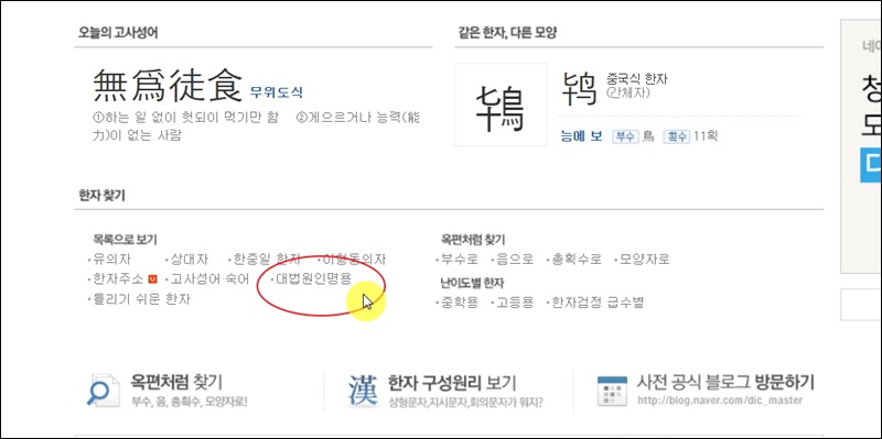 한자사전 사이트에서 화면을 내려보면 "대법원 인명용" 서비스가 있는데요. 이를 통해서도 인명용 한자를 모두 찾아볼 수 있어요. 이전단계와는 반대의 방식으로 알아보는 것이죠.