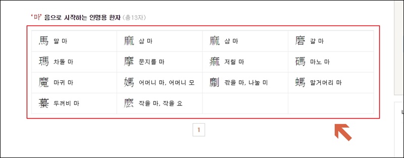 저는 "마"자를 선택해 보았어요. 그럼 해당 음을 가진 인명용 한자가 13개 나타나는데요. 여기에 나온 한자를 이름에 사용할 수 있어요. 또 한가지 해당 한자를 클릭해 보세요.