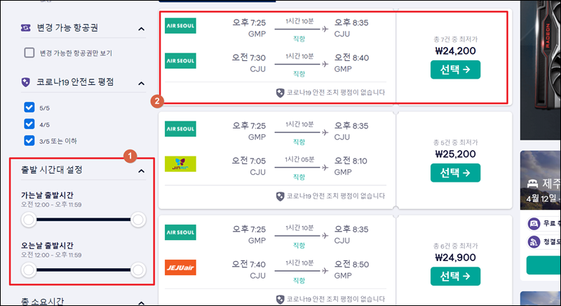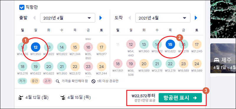 저는 제주행 저가항공권을 찾아보려고 하는데요. 날짜 선택을 잘하니 왕복으로 22,572원짜리 티켓을 찾았네요.