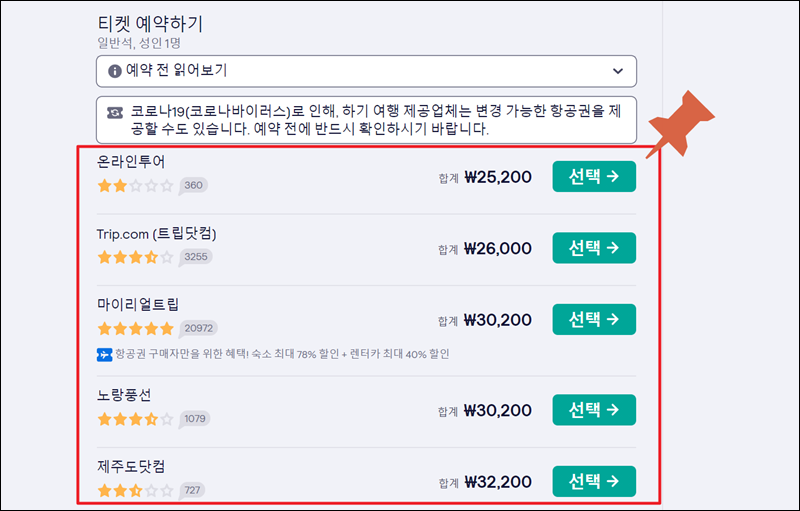 스카이스캐너에서 마음에 드는 저가항공권을 찾았다면 클릭해 보세요. 그럼 예매사이트를 선택하는 페이지가 열려요. 업체의 별점이나 제시하는 가격을 비교한 후 마음에 드는 곳을 선택하면 돼요.
