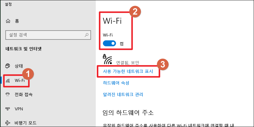 네트워크 연결 페이지가 열리면 좌측에 있는 목록에서 "Wi-Fi"를 선택해 주세요. 그럼 와이파이를 켤 수 있는 화면이 나타나는데요. 와이파이를 켠 후 "사용 가능한 네트워크 표시"를 클릭해 주세요.