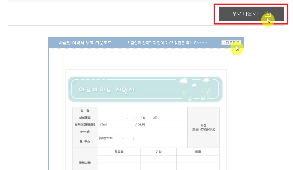 파일을 선택하면 이렇게 알바 자리를 구할 때 사용할 수 있는 이력서 양식을 무료로 받을 수 있는 페이지가 열리는데요. 여기서 다운로드 버튼을 누르면 바로 파일을 무료로 받아볼 수 있어요.