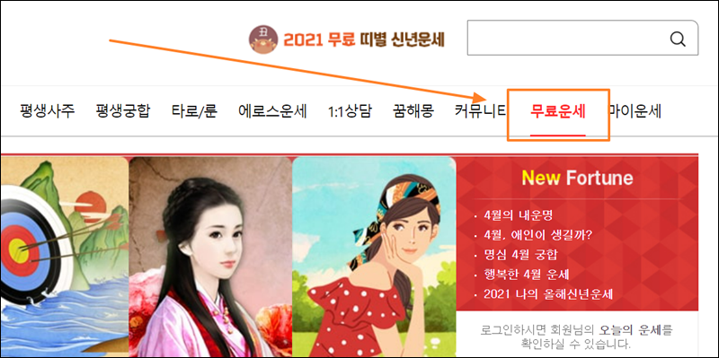 네이트 운세 사이트에 접속해보면 평생사주, 평생궁합, 타로, 룬, 꿈해몽 등 이용해 보고 싶은 서비스가 많은데요. 오늘은 메뉴에서 오른편에 위치한 "무료운세"를 이용해 볼 거에요. 무료로 이용할 수 있는 운세 중에 타로와 별자리에 관련된 것이 있기 때문이에요.